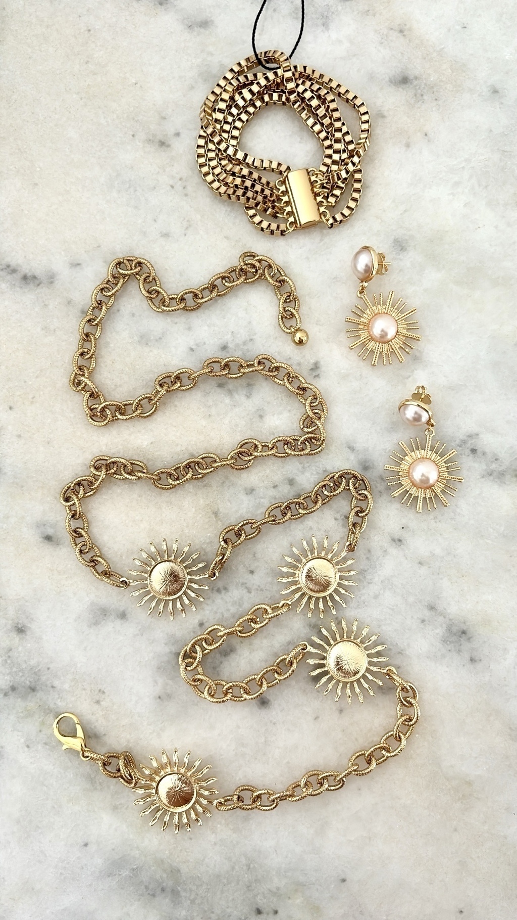 Cinto dourado com pingentes de sol. Estilo vintage.