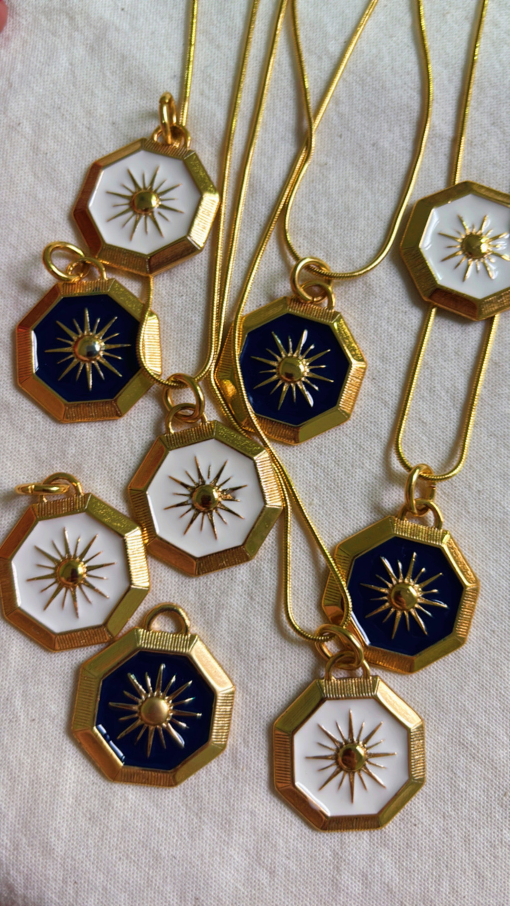 Colar de corrente estilo rabo de rato, com pingente de estrela dourada e fundo azul marinho.