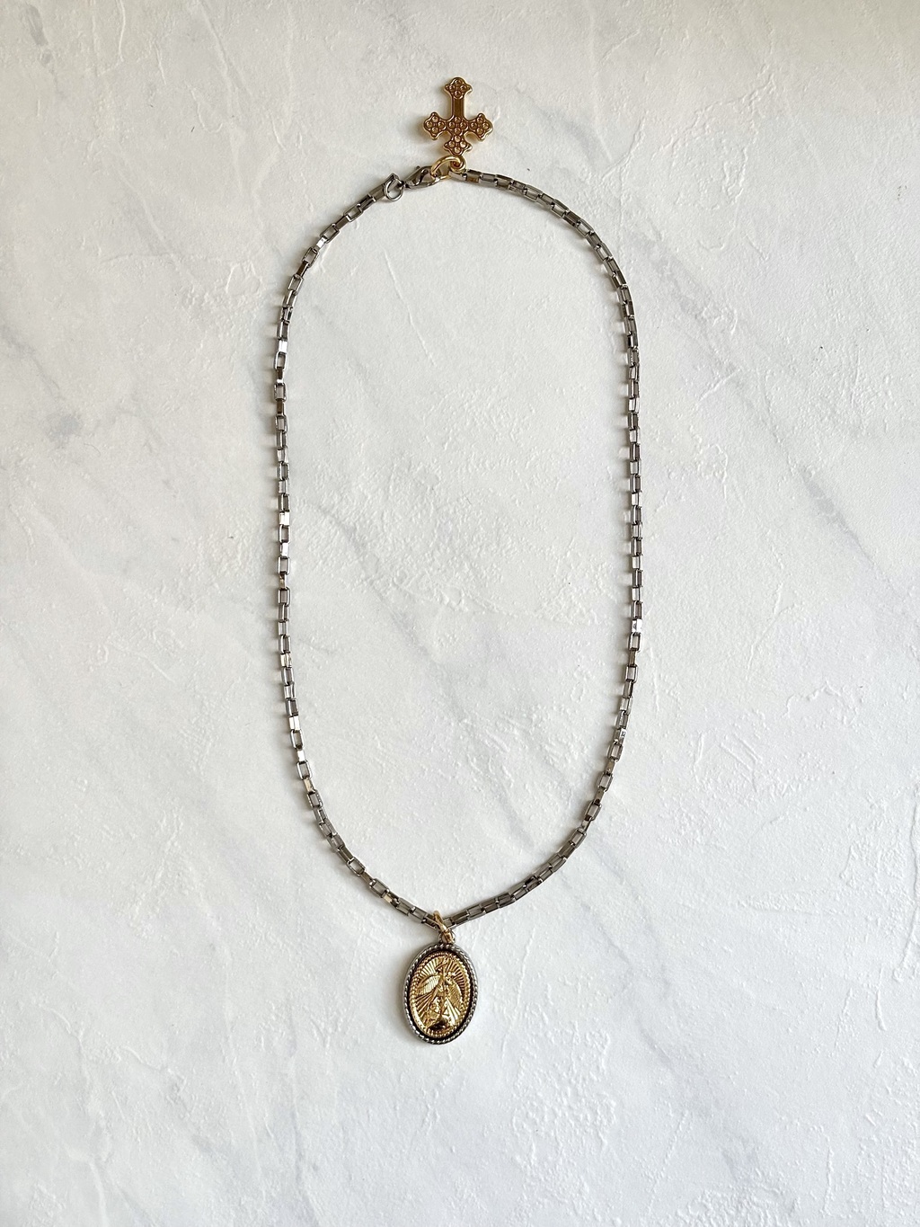 Colar com pingente dourado e prateado de São Miguel Arcanjo.
