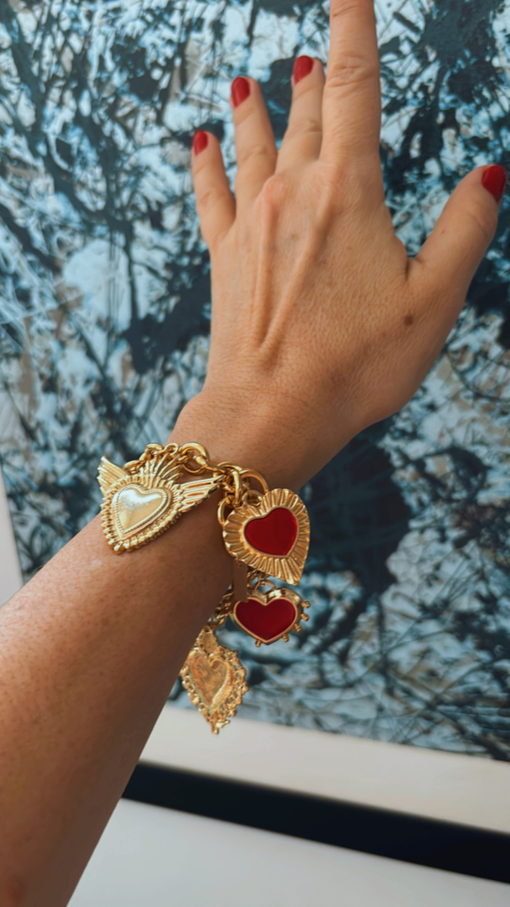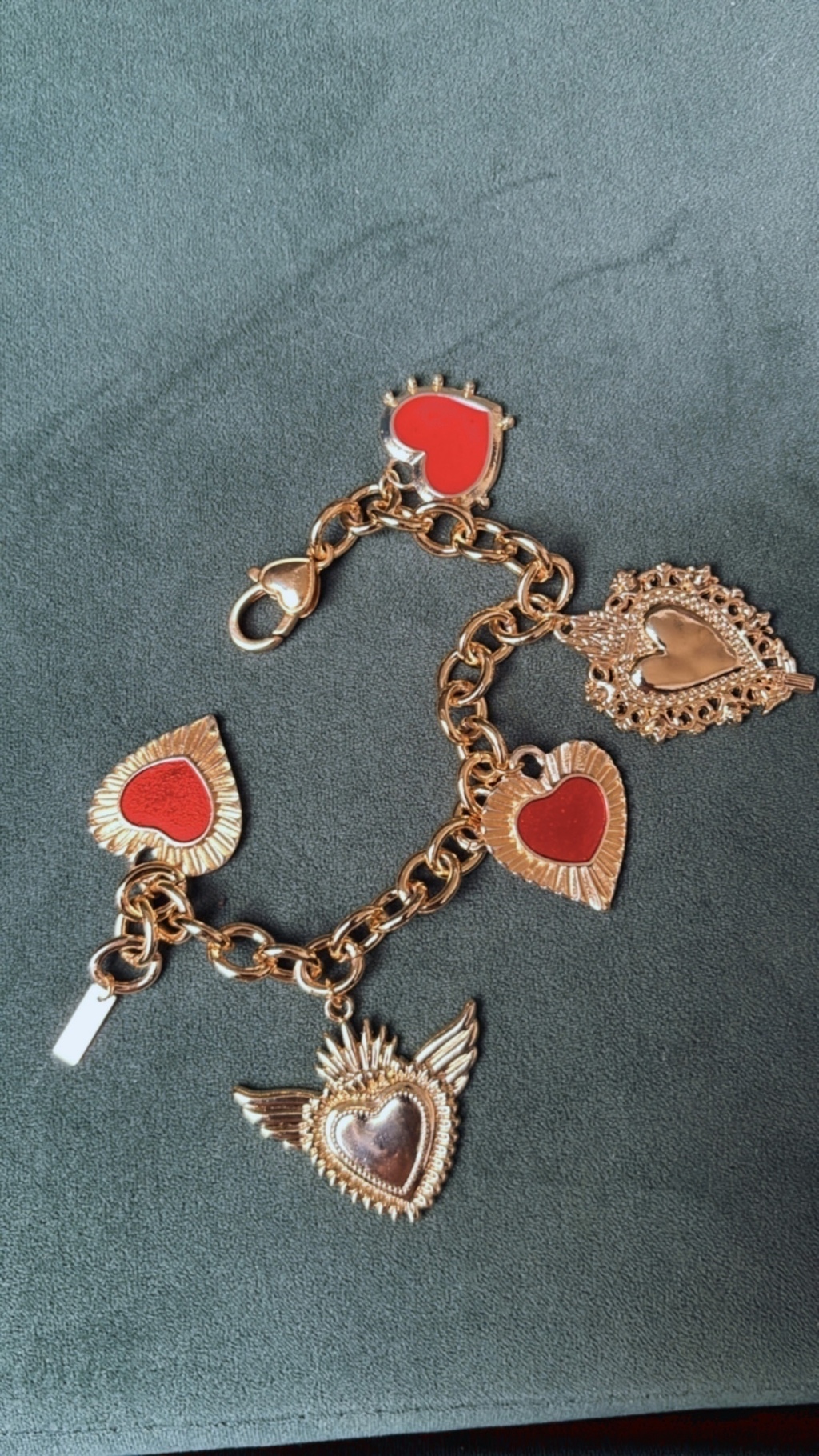 Pulseira dourada de elos, com pingentes de corações.