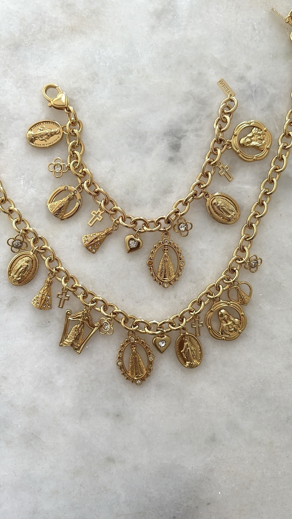 Pulseira linda com pingentes de Nossa Senhora, flores, cruz e coração. Fecho mosquetão com coração.